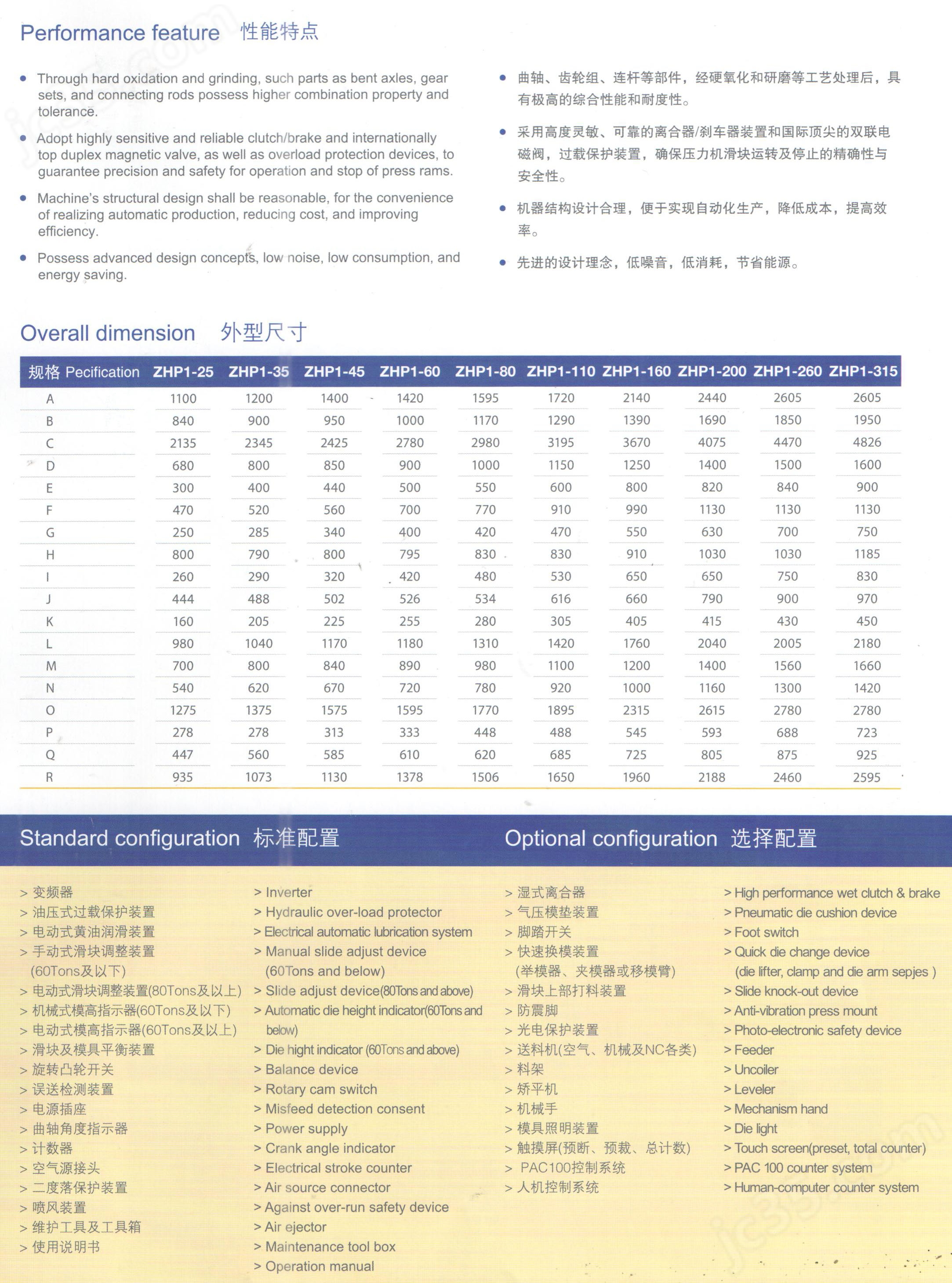 标准配置:变频器、油压式过载保护装置、手动式滑块调整装置(60Tons及以下)、电动式滑块调整装置(80Tons及以上)、机械师模高指示器(60Tons及以下)电动式模高指示器(60Tons级以上)滑块及模具平衡装置、旋转凸轮开关、误送检测装置、电源插座、曲轴角度指示器、计数器、空气源接头、二度落保护装置、喷风装置、维护工具及工具箱、使用说明书