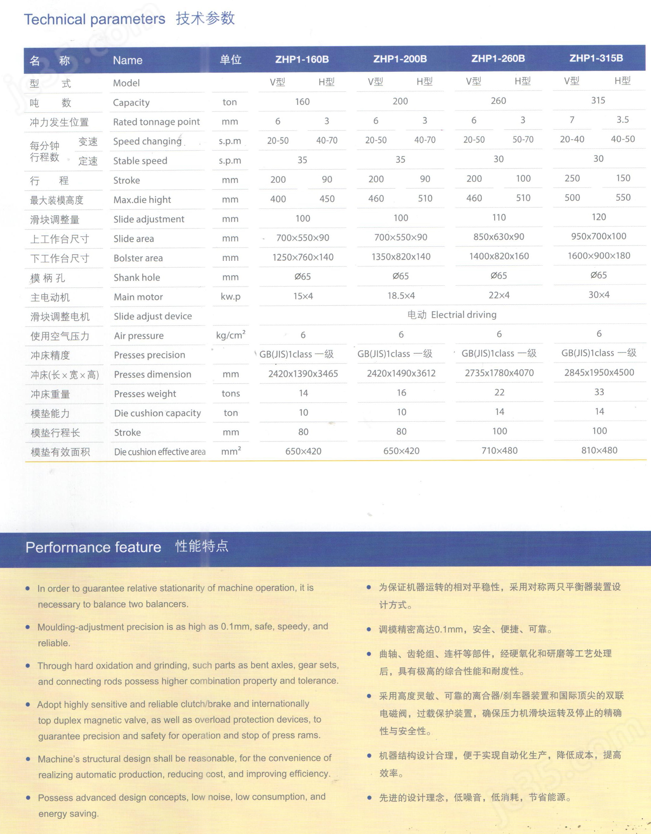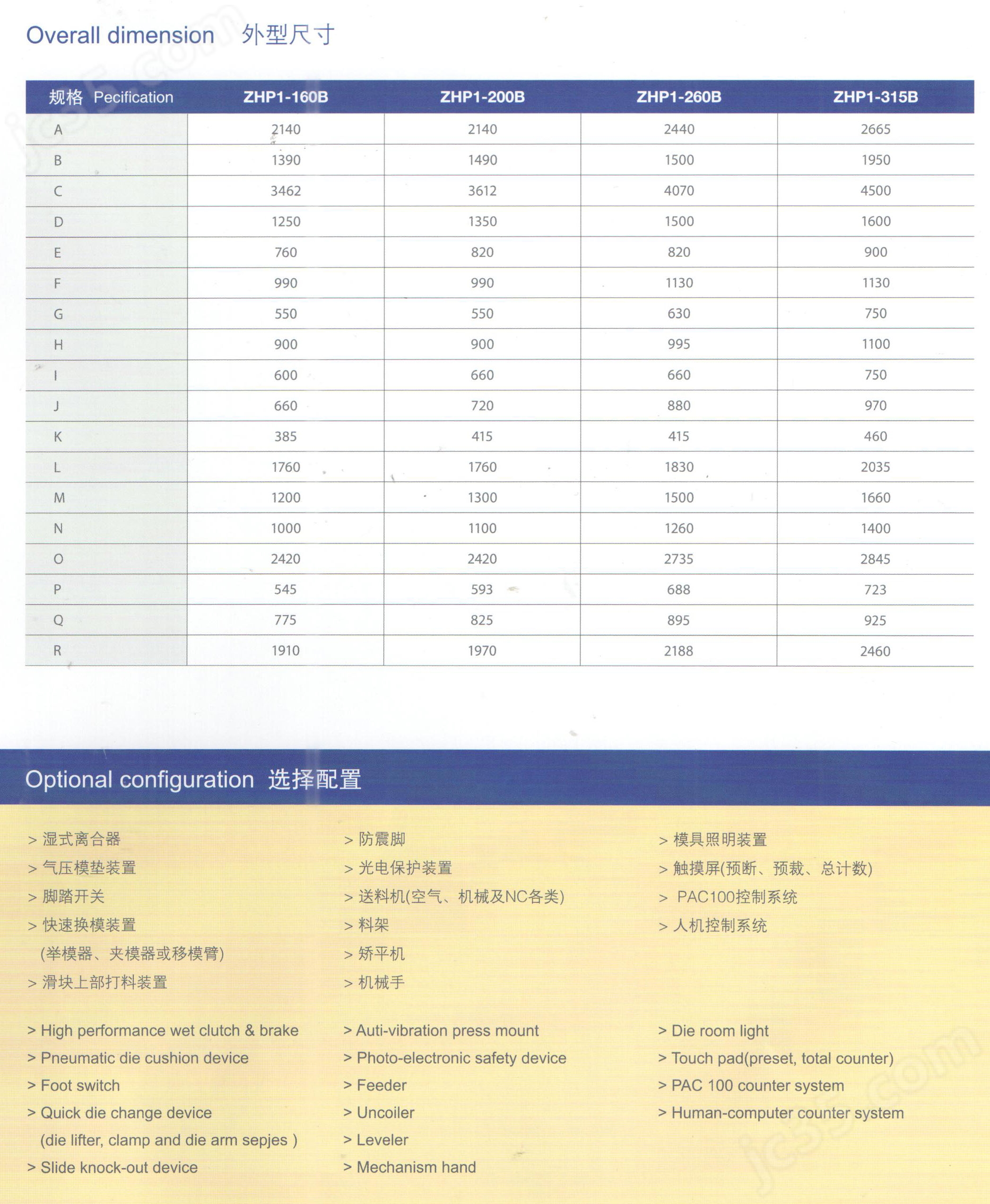 选着装置:湿式离合器、气压模垫装置、脚踏开关、快速换模装置(举模器、夹模器或移模臂)滑块上部打料装置、防震脚、光电保护装置、送料机(空气、机械及NC各类)料架、轿平机、机械手、模具照明装置、触摸屏(预断、预载、总计数)PAC100控制系统、人机控制系统。